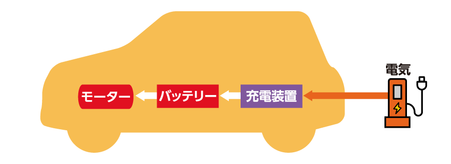 電気を動力源とし、走行中にCO₂を排出しません。バッテリーに蓄えられた電気を家庭に供給したり、外出先で電源として活用したりすることも可能です。コストが高い点や充電設備の整備などが課題とされていますが、現在、航続距離を伸ばし、充電時間を短縮するためのバッテリー技術や、全固体電池などの次世代技術の開発が進められており、国も2030年までに公共用急速充電器3万口を含む30万口の充電インフラ整備を目指しているなど、普及に向けた取組が進められています。