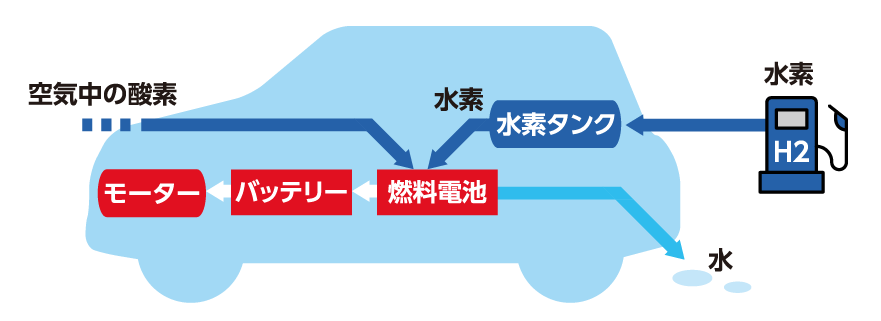 水素を燃料とし、空気中の酸素と化学反応させて電気を作り出し、電気モーターで走行します。走行時にCO₂を排出しません。コストが高く、水素充填ステーションの整備が課題とされていますが、EVの充電時間と比べ、FCVの燃料である水素は充てん時間が短く、また、航続距離が長いという利点を活かし大型トラック、小型トラック及びバスといった燃料電池商用車での活用も期待されています。