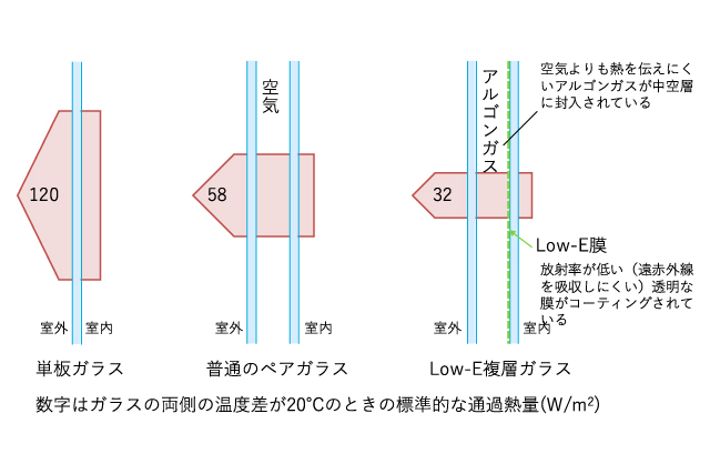 *1 Low-E複層ガラス:2枚のガラスで中間層をつくり断熱性能を高めた複層ガラスに、さらに断熱性能、遮熱性能を高めるため特殊な膜をコーティングしたガラスのことです。
