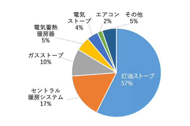 北海道で使われている暖房機器は、既存住宅を含めると灯油ストーブが最も多く、戸建て住宅では1990年代以降、ボイラーの温水を各室に設置した放熱器に供給するセントラルヒーティングが普及しました。なお、図5は全道データであり、札幌市など都市ガスが使用できる地域では、ガスストーブやガスを熱源とするセントラルヒーティングの割合が多い傾向があります。