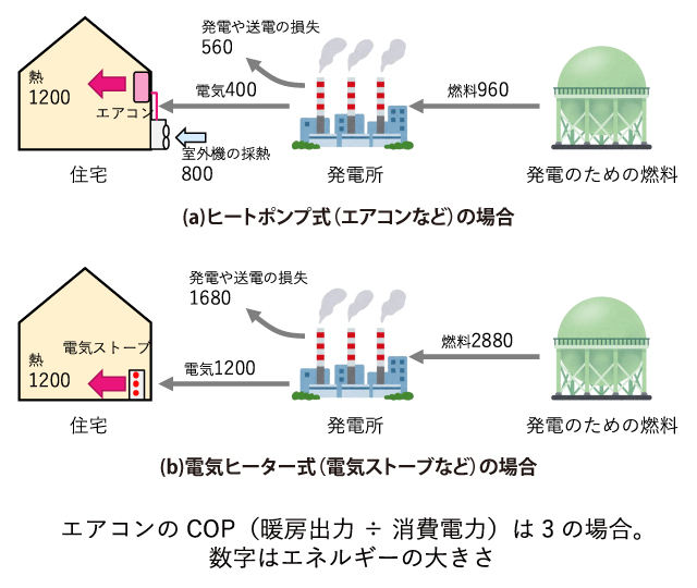 これに対し、電気ヒーター式の場合は、図6(b)のように消費した電気がそのまま熱に変わるだけです。太陽光発電が期待できない冬季の夜間の電気は現在も多くが火力発電所で作られており、発電・送電の損失を考慮すると、燃料の持つエネルギーの4割程度しか暖房に利用できません。これであれば、住宅の中のストーブで燃料を燃やして暖房したほうがずっとエネルギー効率が良いことになります。