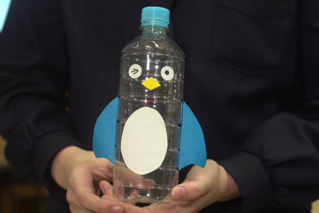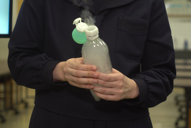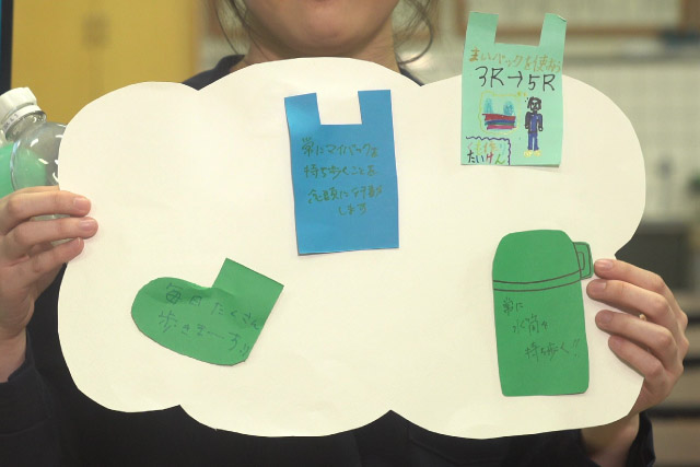 ペットボトルを使って雲を発生させ、気温の上昇でたくさんの雲ができ、大雨などをもたらすことを紹介。実験を見て学んだ後には、「LED・省エネ家電などを選ぶ」「できるだけ公共交通・自転車・徒歩で移動する」「食品を食べきる」など、それぞれが取り組みたいデコ活を、マイボトルなどを形取った紙に書いてもらい、掲示しました。