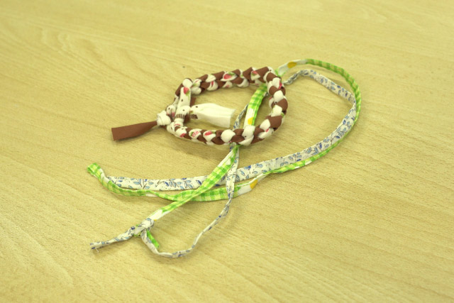 布の端切れのアップサイクルとしてミサンガ作りを提案。好きな布で編んでもらいました。