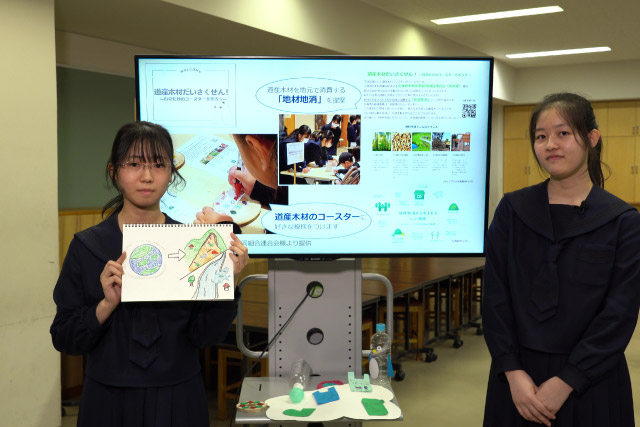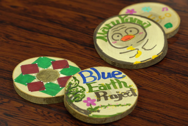 道産木材を地元で消費する「地材地消」を提案。北海道木材産業協同組合連合会様にご提供いただいたコースターに、好きな模様をつけてもらいました。