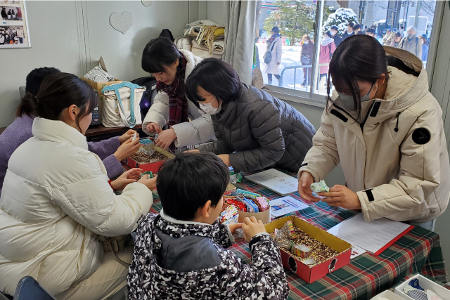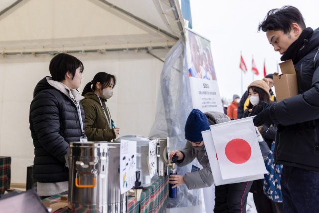 札幌市環境局のご協力のもと、2023年、2024年の「さっぽろ雪まつり」では小豆カイロ作りのブースを出展しました。また、「環境広場さっぽろ2024」では端切れを使ったくるみボタン作りのブースを出展したほか、スキージャンプの原田雅彦さん、中村直幹選手のトークショーに参加させていただきました。