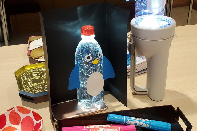 光を拡散させるペットボトルの性質を利用したランタン作りです。好きなようにシールを貼って可愛く仕上げてもらいました。
