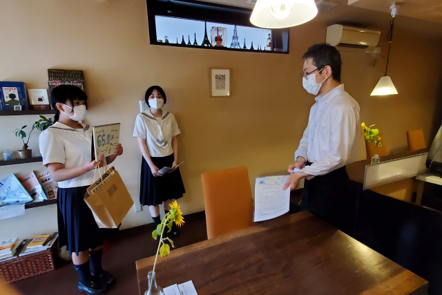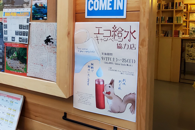 1つめは「エコ給水キャンペーン」です。空のマイボトルを持参すると無料で給水していただけるよう、学校近辺の約40の飲食店に自分たちでうかがい、ご協力をお願いしました。