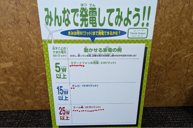 このコーナーでは発電体験を通じて電気の大切さを実感してもらい、少しでも省エネ活動に取り組んでいただこうという狙いがあります。
