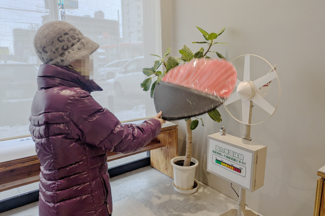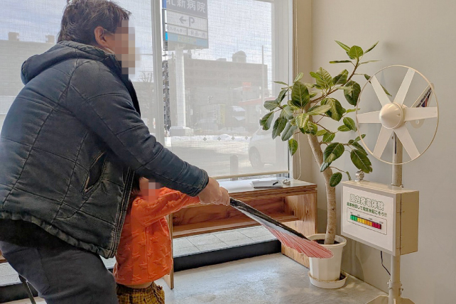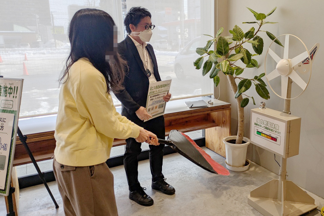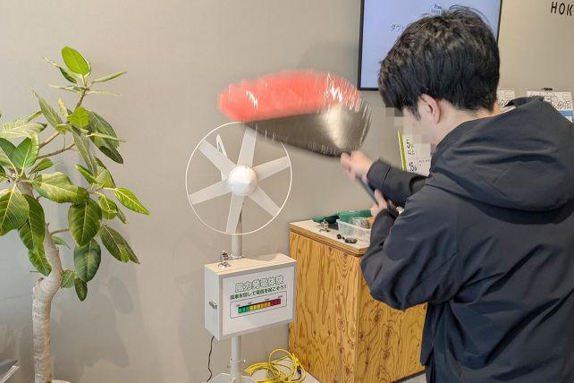 大きなうちわを使って、自分の力で電気をつくり出す体験ができるコーナーを実施しました。