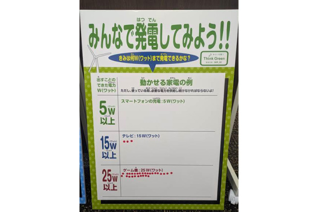このコーナーでは発電体験を通じて電気の大切さを実感してもらい、少しでも省エネ活動に取り組んでいただこうという狙いがあります。