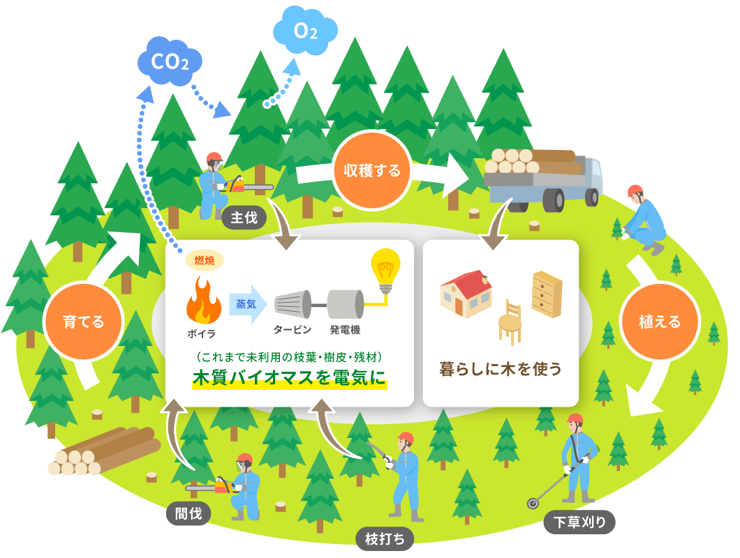 話は戻りますが、2015年のトドック電力設立時から活用させていただいているのが、細かく砕いた木材チップを利用する木質バイオマス発電所の電力です。2021年4月には再生可能エネルギー100%メニュー(FIT電気*2+FIT非化石証書*3)の体制を実現し、ご家庭にも提供しています。木質バイオマスによる発電では、木の成長を促すために伐採された間伐材などを使うため、未利用資源の活用や二酸化炭素を吸収する森林の整備に役立つなど環境面で非常に意義があると考えています。