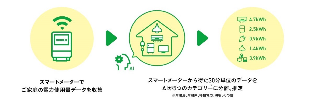 コープさっぽろでは、木質バイオマスのような再エネによる電力をお届けすると同時に、脱炭素に向けて省エネにも貢献したいと考え、2024年11月1日からトドック電力をご契約いただいている組合員のご家庭向けに「トドでんAI(アイ)」という無料サービスを開始しました。これは、冷暖房・冷蔵庫・照明・待機電力・その他の5種類について、何にどれくらい電力を使ったかをAIを活用して「見える化」するもので、電力の使い方を認識し、節電につなげていただこうというものです。特別な器具は不要で、スマートメーターによって示される電力の波形からAI技術で使用状況を推定、最短で翌日にはマイページでご確認いただけます。