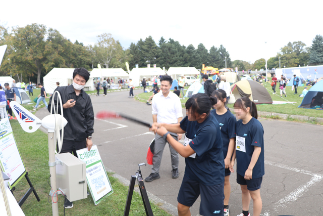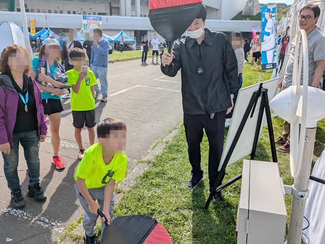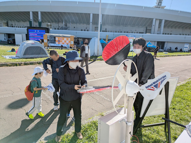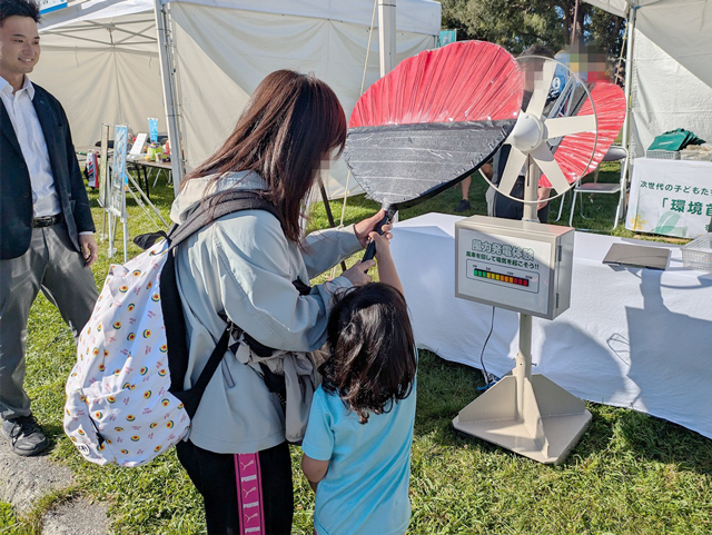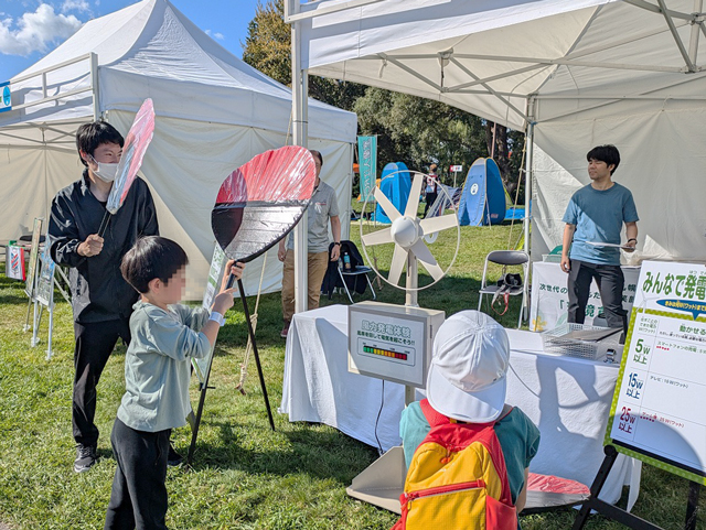 大きなうちわを使って、自分の力で電気をつくり出す体験ができるコーナーを実施しました。