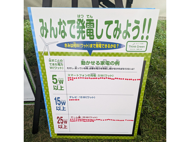 このコーナーでは発電体験を通じて電気の大切さを実感してもらい、少しでも省エネ活動に取り組んでいただこうという狙いがあります。